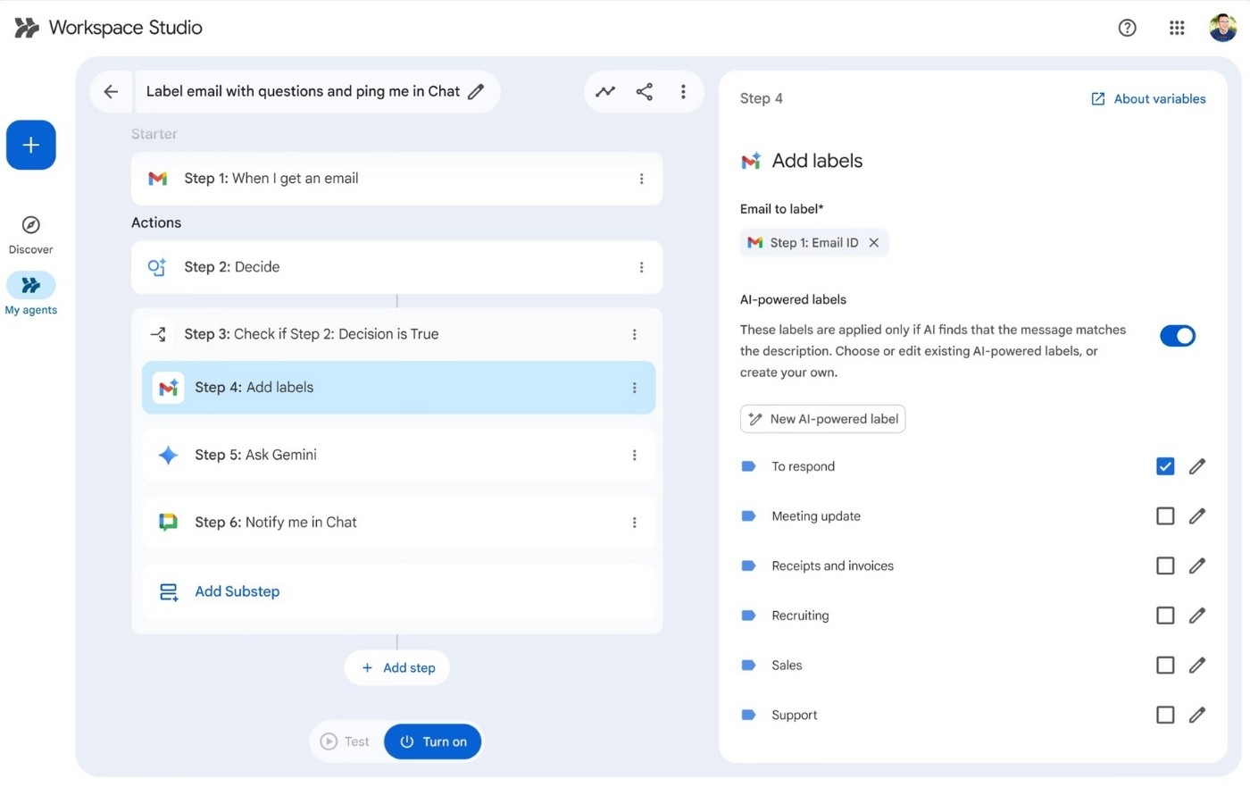 Verwar Workspace Studio niet met de Google Gemini-chatbot. De chatbot is een assistent (je stelt een vraag, je krijgt antwoord). Workspace Studio is een bouwer.